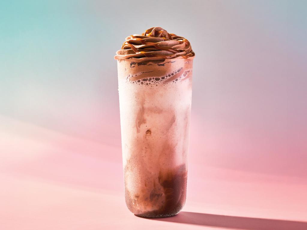 A creamy whipped iced frappe made with chocolate and caramel sauce,...