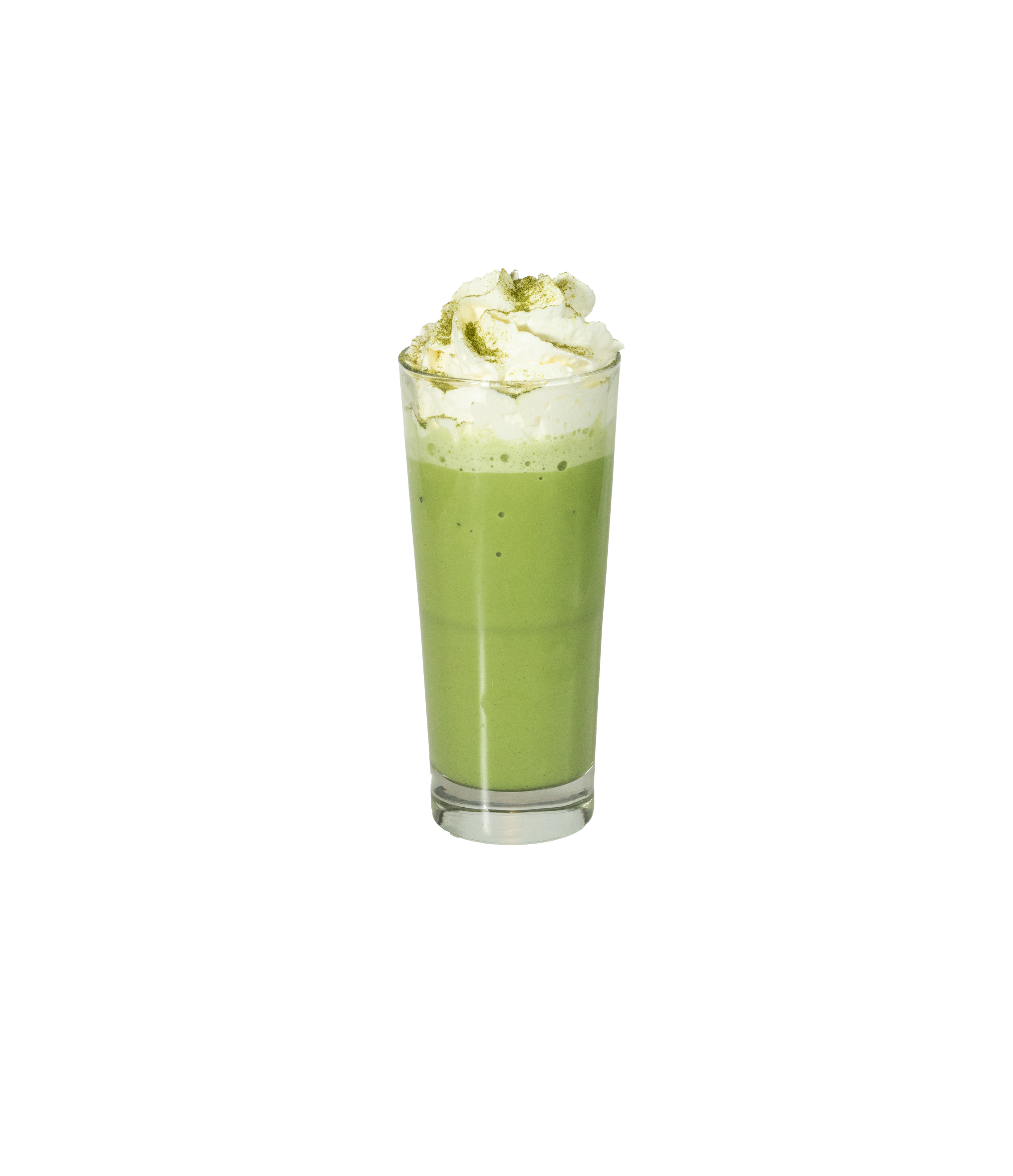 Frappepulver med matcha, havremjölk & toppad med vegansk grädde.
