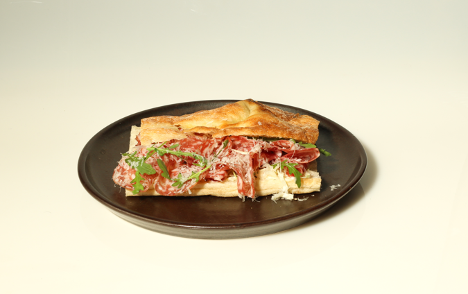 Italienskt luftigt bröd med tryffelsalami och Pecorino Romano som...
