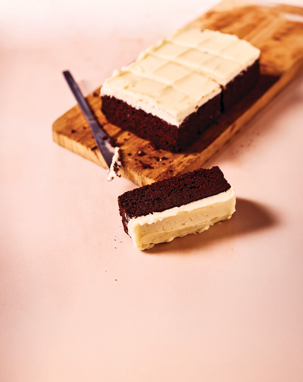 A velvety dark brown stout cake, dense and fudgy with the rich flavour of stout. Topped with a smooth and creamy white frosting.