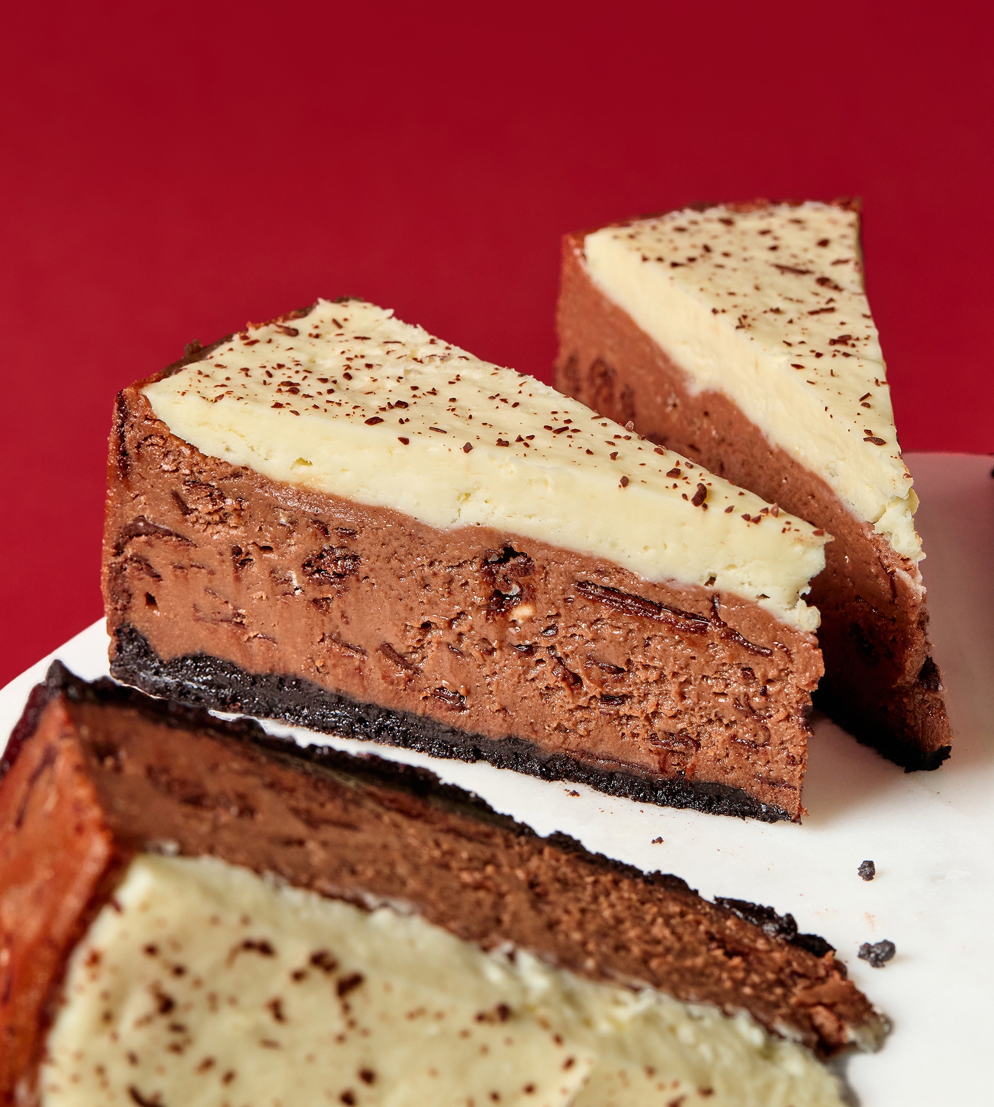 Milk chocolate cheesecake with a layer of vanilla mousse sprinkled...