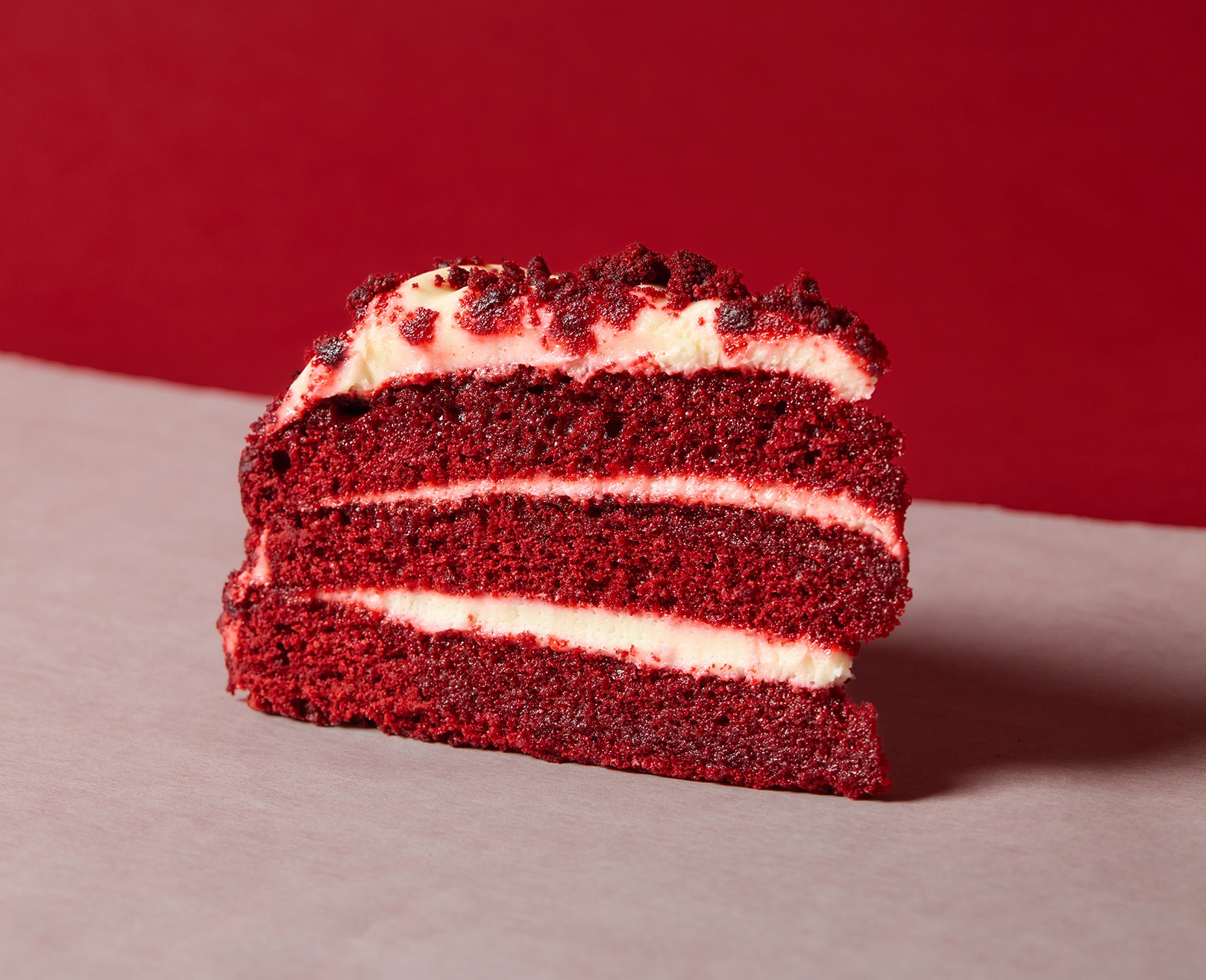 A rich red velvet cake layered with silky cream cheese frosting and...