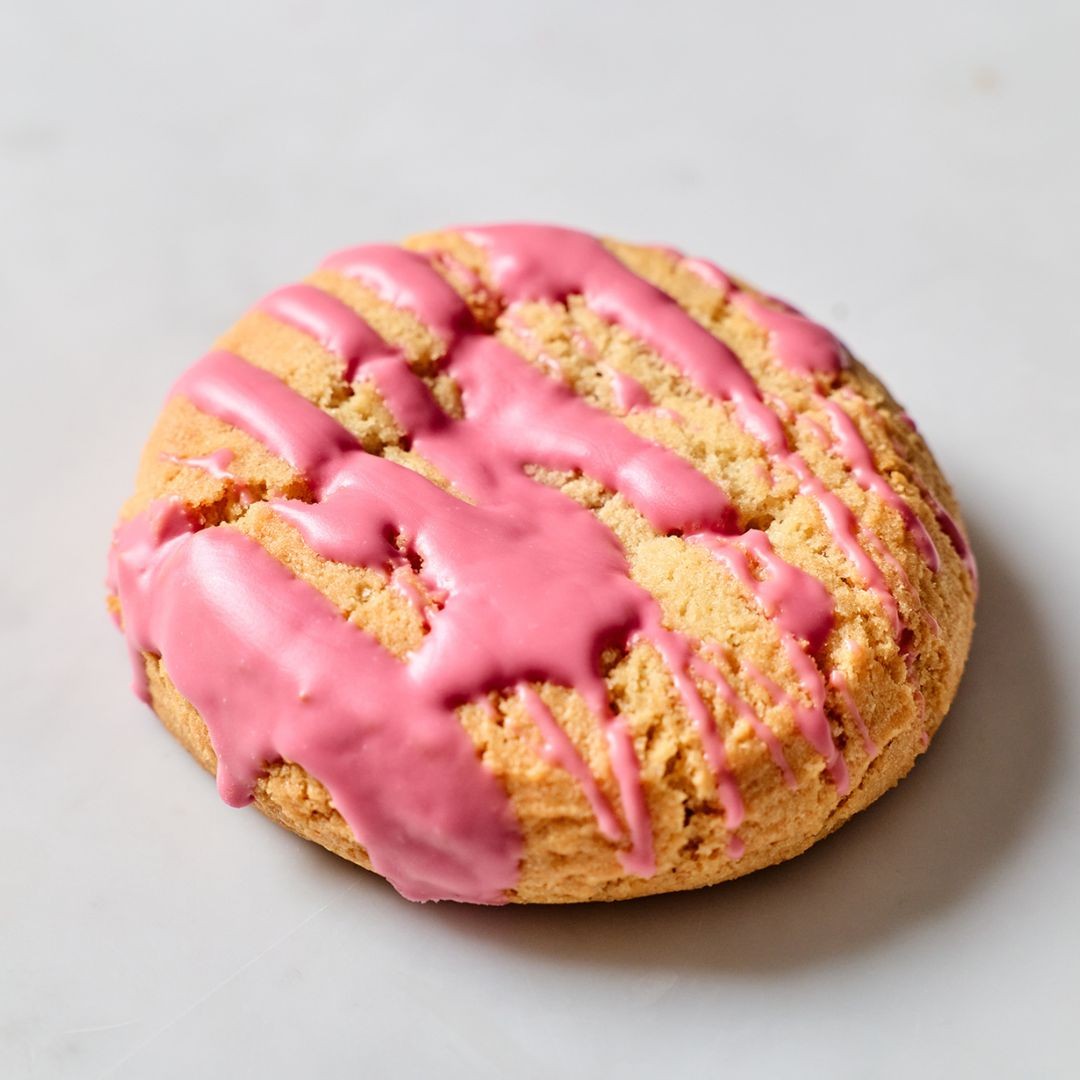 A freshly baked sugar cookie topped with strawberry drizzle.