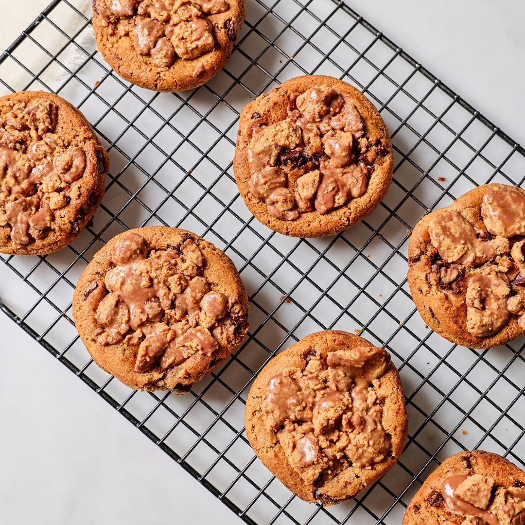 A warm freshly baked chocolate chip cookie topped with chopped Reese’s peanut butter cups.